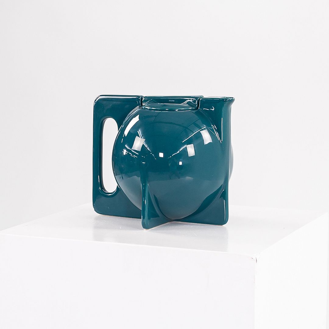 This is an Art Deco Bauhaus-style Teapot in Peacock Blue Glazed Ceramic, designed and produced by Era Keramik in Switzerland in the 1940s. The silhouette incorporates both curves and straight lines, emblematic of Western European ceramics in the 1930s-1940s.