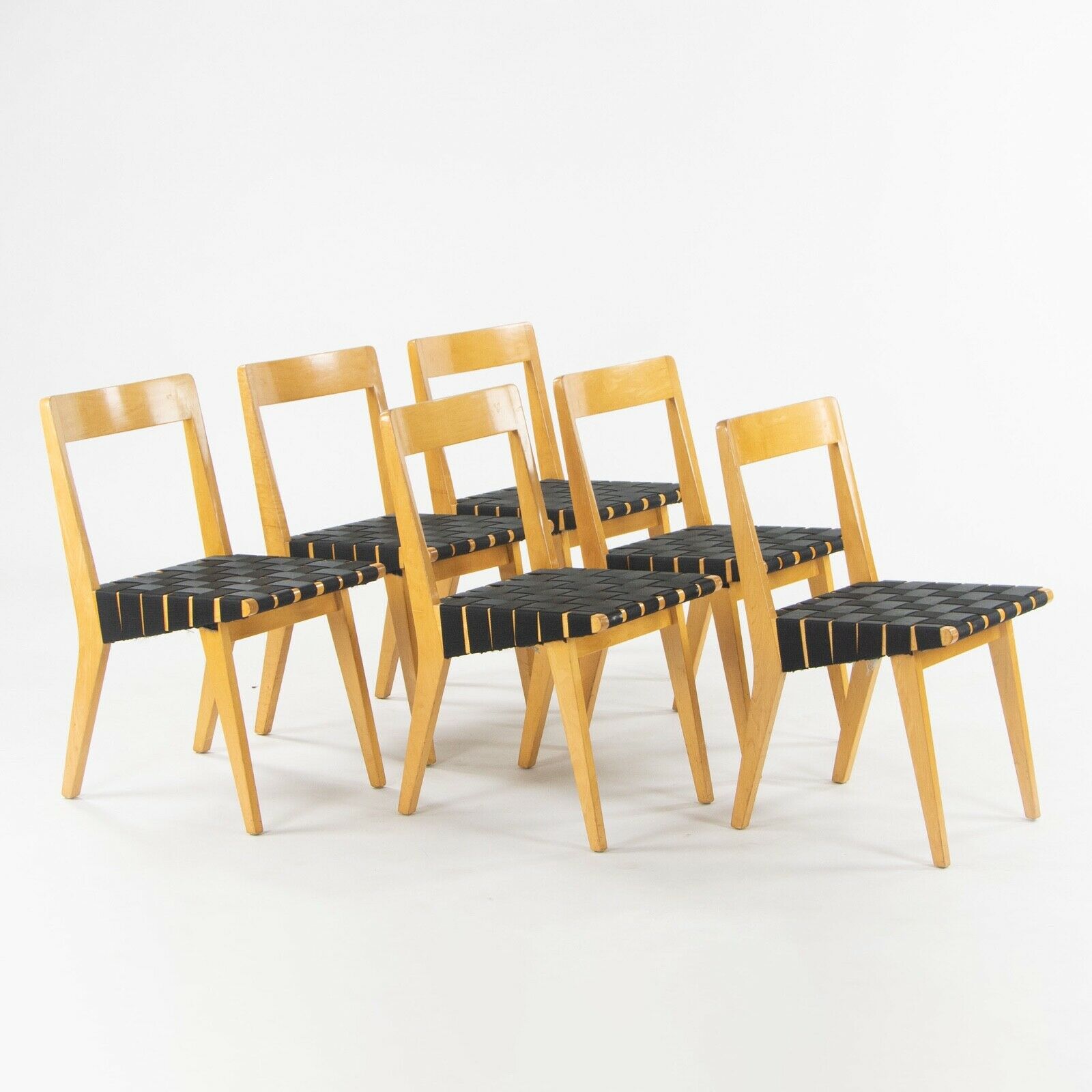 Listed for sale is a set of six circa mid 1940s dining chairs designed by Jen Risom and produced by Knoll Associates. The model number is 666 WSP, a model introduced by Knoll Associates in 1941. These pieces were constructed using a solid maple wooden frame and black webbing that is stain resistant. The chairs were acquired from a Wisconsin estate and were just freshly reupholstered with new black webbing. The chairs are unmarked but guaranteed as authentic Risom examples.