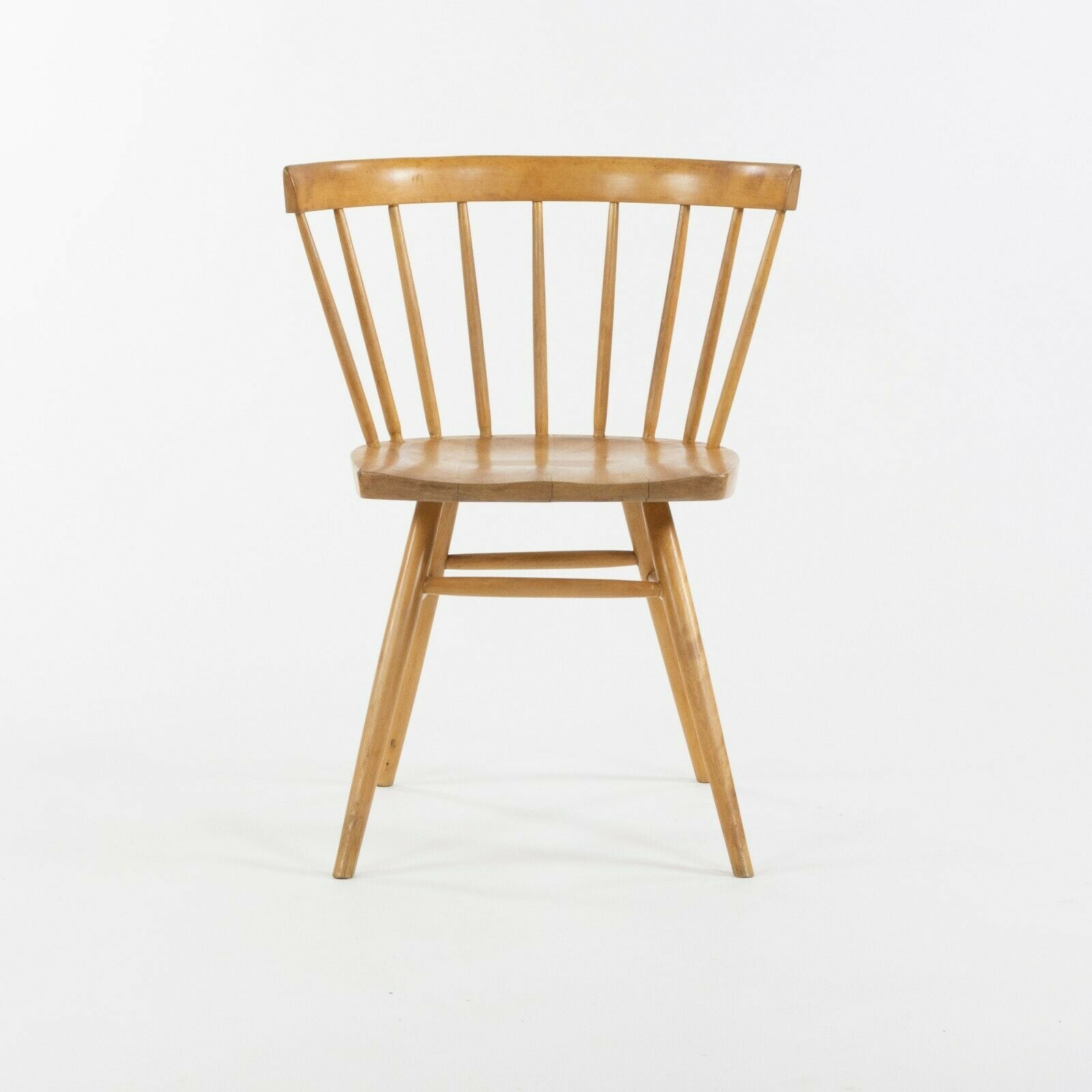 Listed for sale is a gorgeous early George Nakashima for Knoll N19 birch straight chair, produced by Knoll Associates. This chair appears to be natural birch. It shows some wear from use as can be seen in the photos. Some light scratches and other wear as would be expected for a chair dating to the 1940's. There are also a couple of small splits, which do not seem to affect the chairs structurally. The finish is in nice condition overall. This early straight chair for Knoll represents some of Nakashima's earliest work and is quite special due to these pieces pre-dating most of his studio designs. The Knoll relationship also pre-dates pieces he did for Widdicomb. This is the earliest variation of the straight chair, as can be noted from the sculpted seat that tapers on the side profile from thick to thin as it moves toward the front of the chair. We have been told that the earliest straight chairs were produced at the Nakashima compound or at a nearby chair shop close to George's studio. Either way, this is a far rarer and more finely crafted version than the uniform-thickness seat straight chair that Knoll produced elsewhere later in the 1940s and perhaps 1950s. The chair measures approximately 28 inches tall by 21.5 inches wide and 19 inches deep.