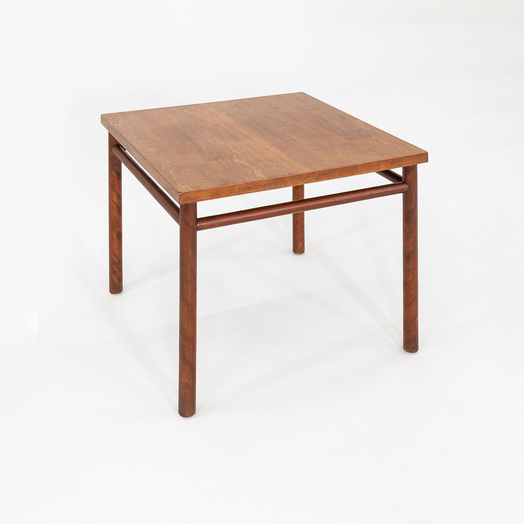 This is a Square Walnut Side or End Table, designed by T.H. Robsjohn-Gibbings for John Widdicomb in 1953. It is composed of walnut, and also has a walnut veneer. The piece is dated 1954 underneath the top, and it retains a Widdicomb label.