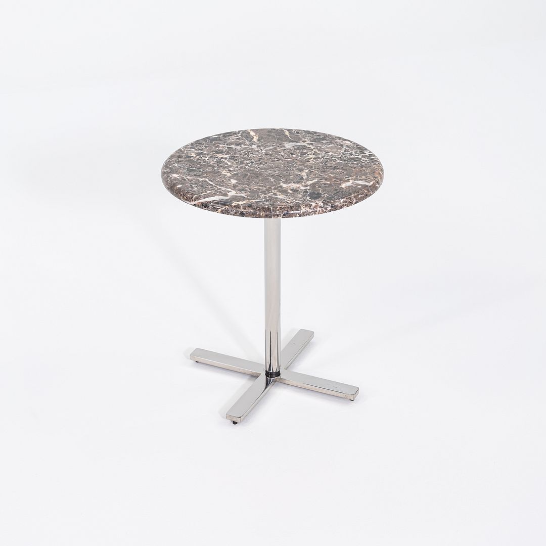 This is a Marble Side Table with a base that is solid and polished stainless steel. The top appears to be Brown Emperador marble or a similar stone. This piece is unmarked so the exact designer and manufacture are unknown.