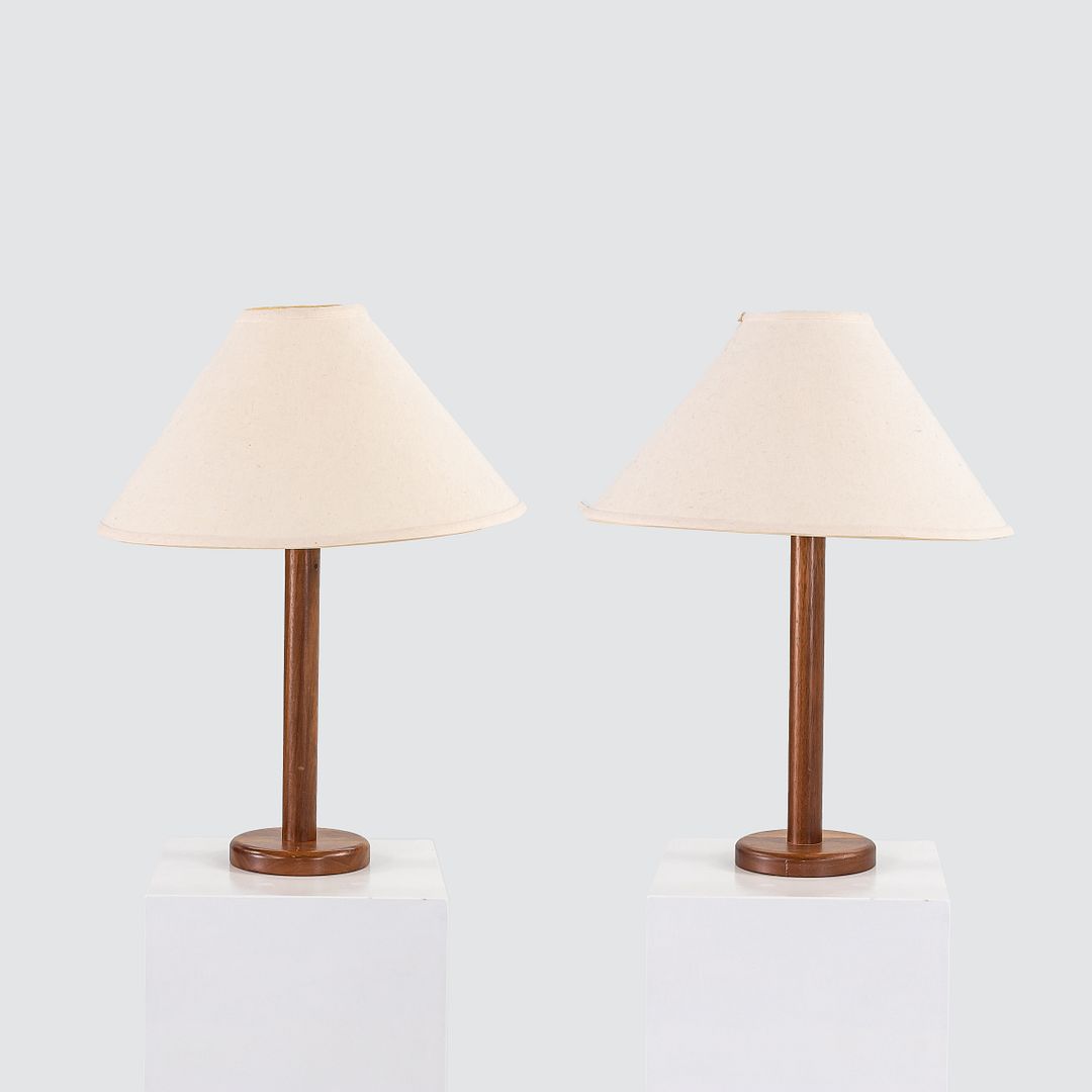 SOLD 1970s Pair of Scandinavian Teak Table / Desk Lamps with White Fabric Shades