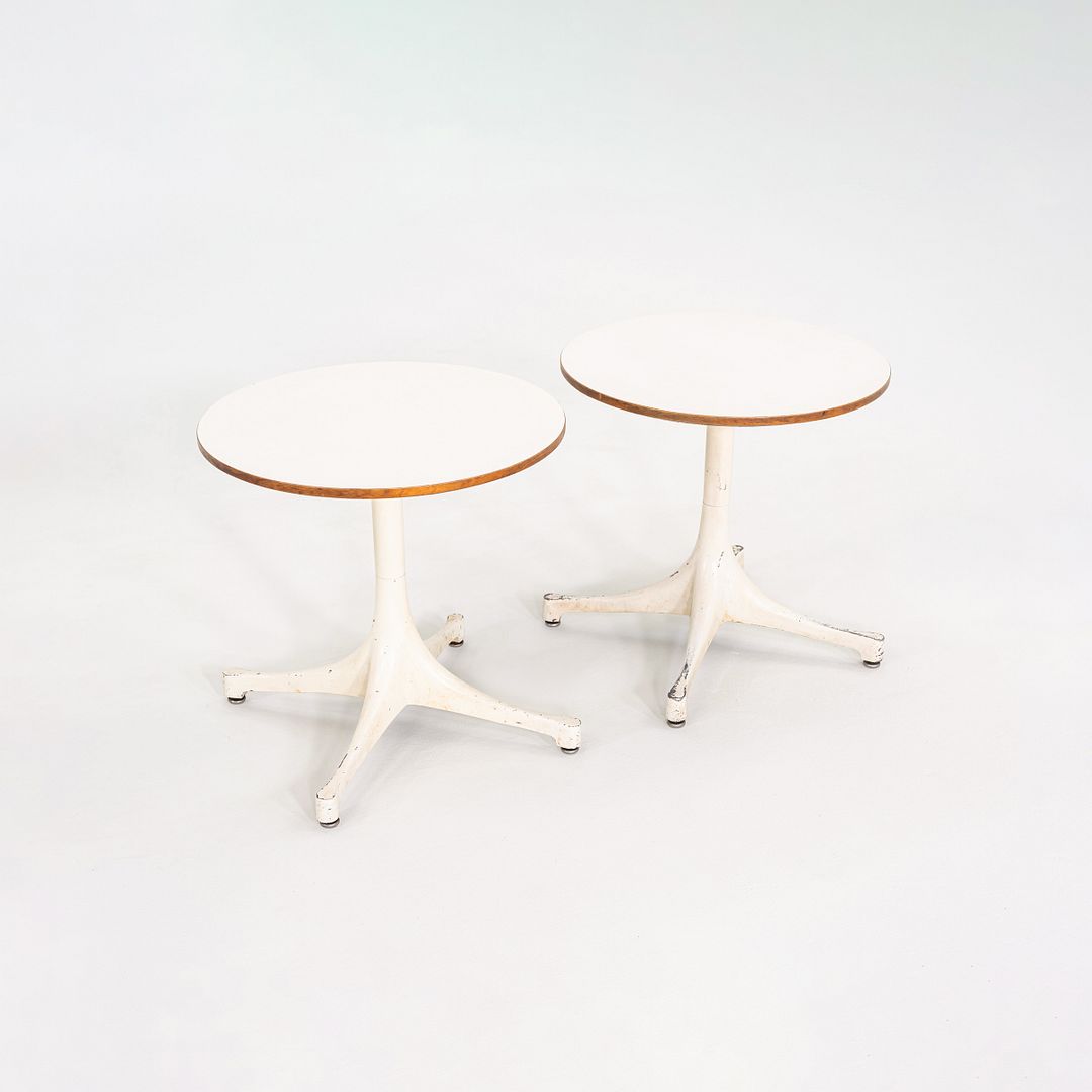 This is a pair of Nelson Pedestal Side Tables, originally designed by George Nelson in 1954. These particular examples were produced by Herman Miller in the United States and date back to the year 1958. The tables are comprised of fiberboard with a white laminate surface atop a white aluminum base.
