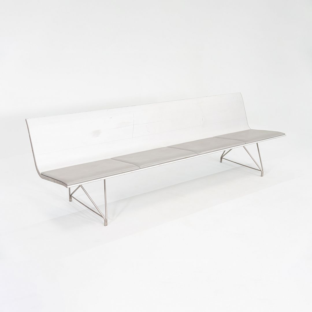 This is an Aero bench, originally designed by Lievore Altherr Molina for Sellex and distributed by Davis in 2001. This particular example was produced in the United States in the 2010s. The bench is constructed entirely from aluminum with seats upholstered in grey leather. The Aero Bench design was based on the grooved aluminum pieces of an aircraft's wing.