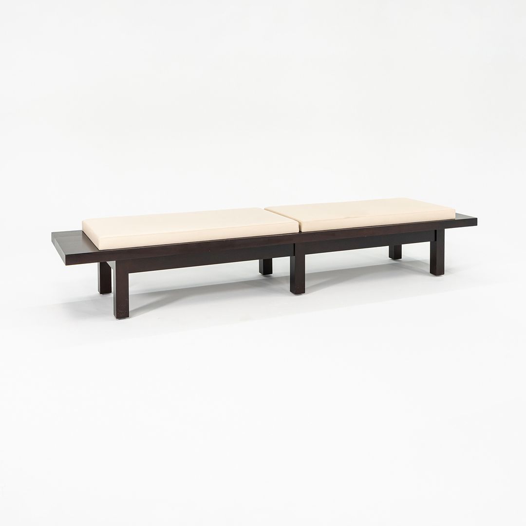This is a Cordovan Wooden Bench, designed by Christian Liaigre for Holly Hunt. The listed price includes one bench, and we currently have two available for purchase. Their design features a thick boxy espresso brown wood base, and has cream leather upholstered cushions. The lines are simple yet gracious, and the contrast between the dark wood and the light leather upholstery looks quite sharp.