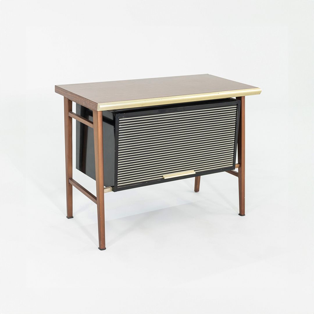 This is a custom Italic Cabinet, designed by Alcoa / Reynolds / GF Studios for Gordon Bunshaft and SOM's Reynolds Metals Headquarters in Richmond, VA. The design is largely seen as a collaboration, as SOM was hugely involved in furniture design at that time through the leadership of Bunshaft. Bunshaft was an important American architect; a leading figure in the modernist movement who was widely recognized for his work in skyscraper design. The collaborators, GF Studios and Alcoa, were able to assist in providing materials and manufacturing. Overall, the idea was to create a furniture collection from Aluminum for the headquarters of Reynolds Metals, a company who’s main focus was…metal. The cabinet’s frame is made from steel, and its design includes a lift-up door that reveals ample storage space inside. We also currently have a coordinating desk that matches this cabinet in our inventory, available for separate purchase. The piece has metal trim in a matte brass electroplated-aluminum, and it has a woodgrain laminate top.