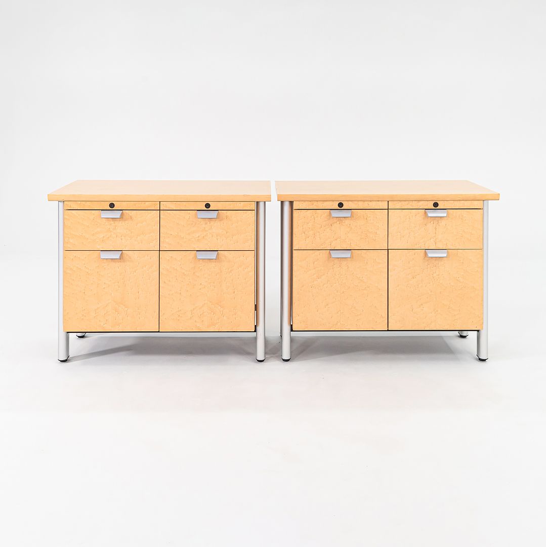 This is a pair of Propeller Credenzas in Birdseye Maple, designed by Emanuela Frattini for Knoll in 1994. The listed price includes one credenza, and we have two available for purchase. Their design features a steel frame, aluminum details, and a burled Birdseye Maple veneer. They have aluminum drawer pulls emblazoned with the Knoll logo, and the two top drawers have locks. They were likely a custom order commissioned shortly after production began circa 1994, and the burled Birdseye Maple facade is seldom seen.