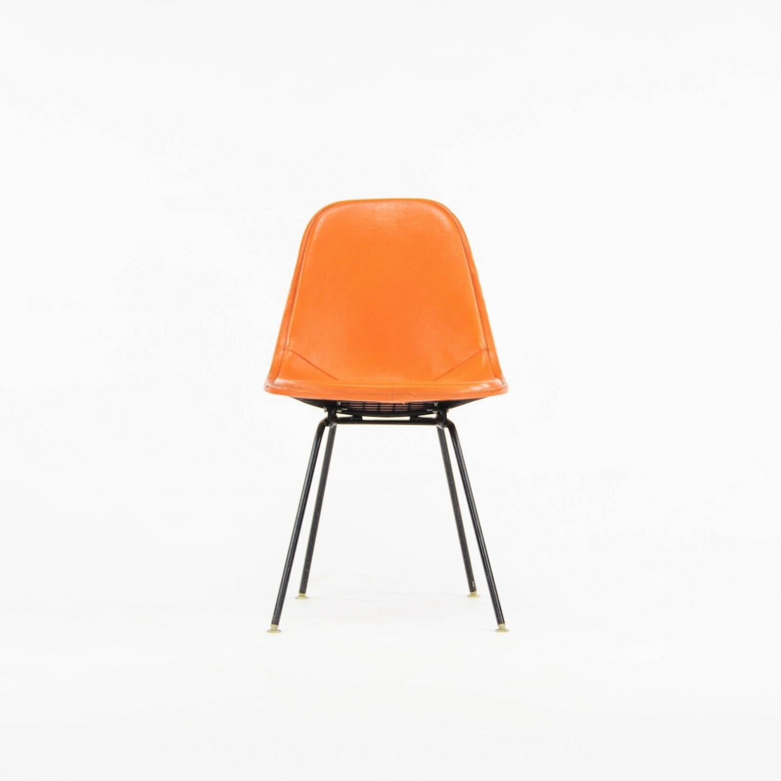 Listed for sale is a single circa 1957 production Eames DKX dining chair with wire upper and fully upholstered pad. The pad is original naugahyde in a red/orange color. The upholstery is overall in very nice shape, showing some wear from use as noted in the photos.