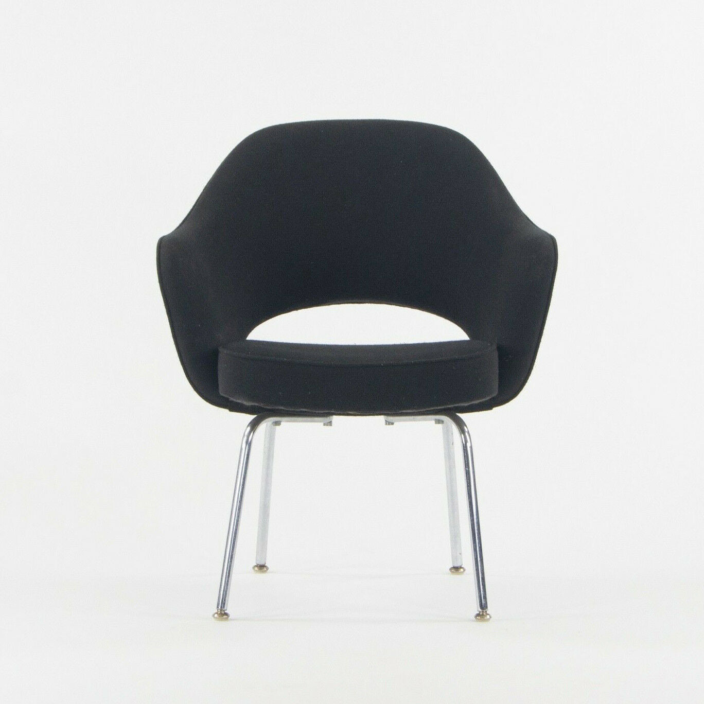 Listed for sale is an Executive Armchair with tubular legs designed by Eero Saarinen and produced by Knoll. This chair was at one point in its life professionally reupholstered in a black hopsack-like fabric. The upholstery was done very nicely. It is in very good condition, showing some wear and signs of use. See photos for condition. This is guaranteed as an authentic Knoll example.