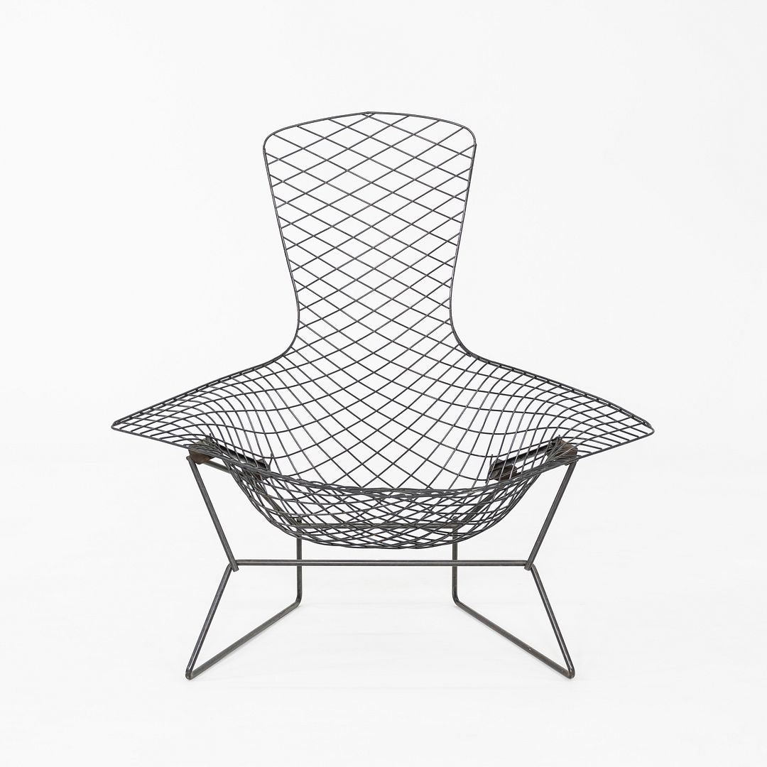 This is an original Bird Lounge Chair, Model 423LU, initially designed by Harry Bertoia for Knoll in 1952. This example was produced in the USA in the 1960s. The design features a body that is formed from interlocking steel wire, and this particular Bird is coated in black Rislan, a rubber-like coating.