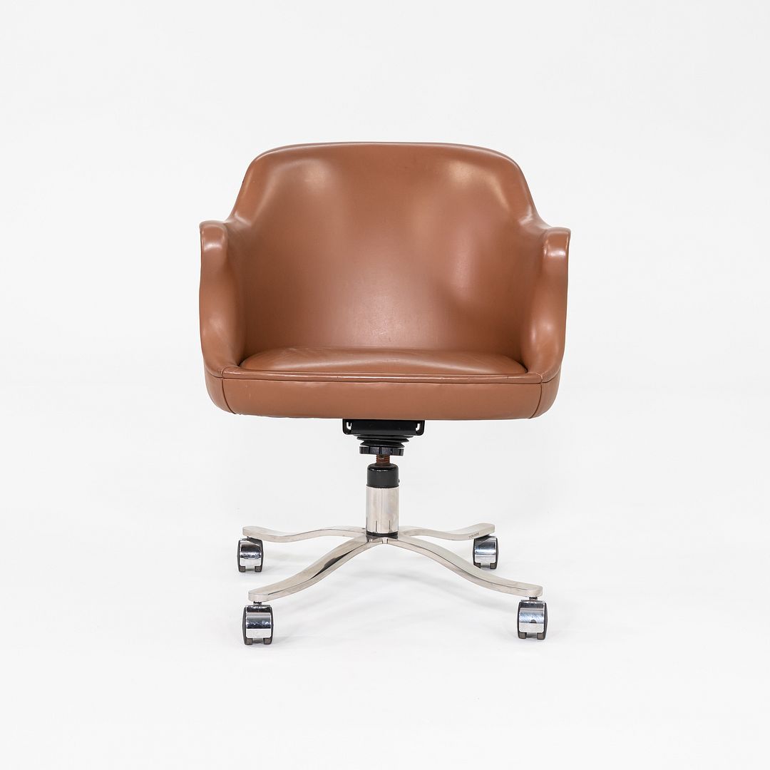 This is an Alpha Bucket Swivel Desk Chair, Model CH.72TC, initially designed by Nicos Zographos in 1964. This example dates to the 1970s. The design includes a polished-steel 4-star swivel base on casters, and the chair is also height adjustable. The cognac brown upholstery on the piece was completed by CBG Associates; Interestingly, Zographos enlisted upholstery shops in and around NYC to execute the upholstery on many of his creations. Zographos was known for utilizing materials of only the highest quality, and the caliber of the workmanship in this piece is outstanding.