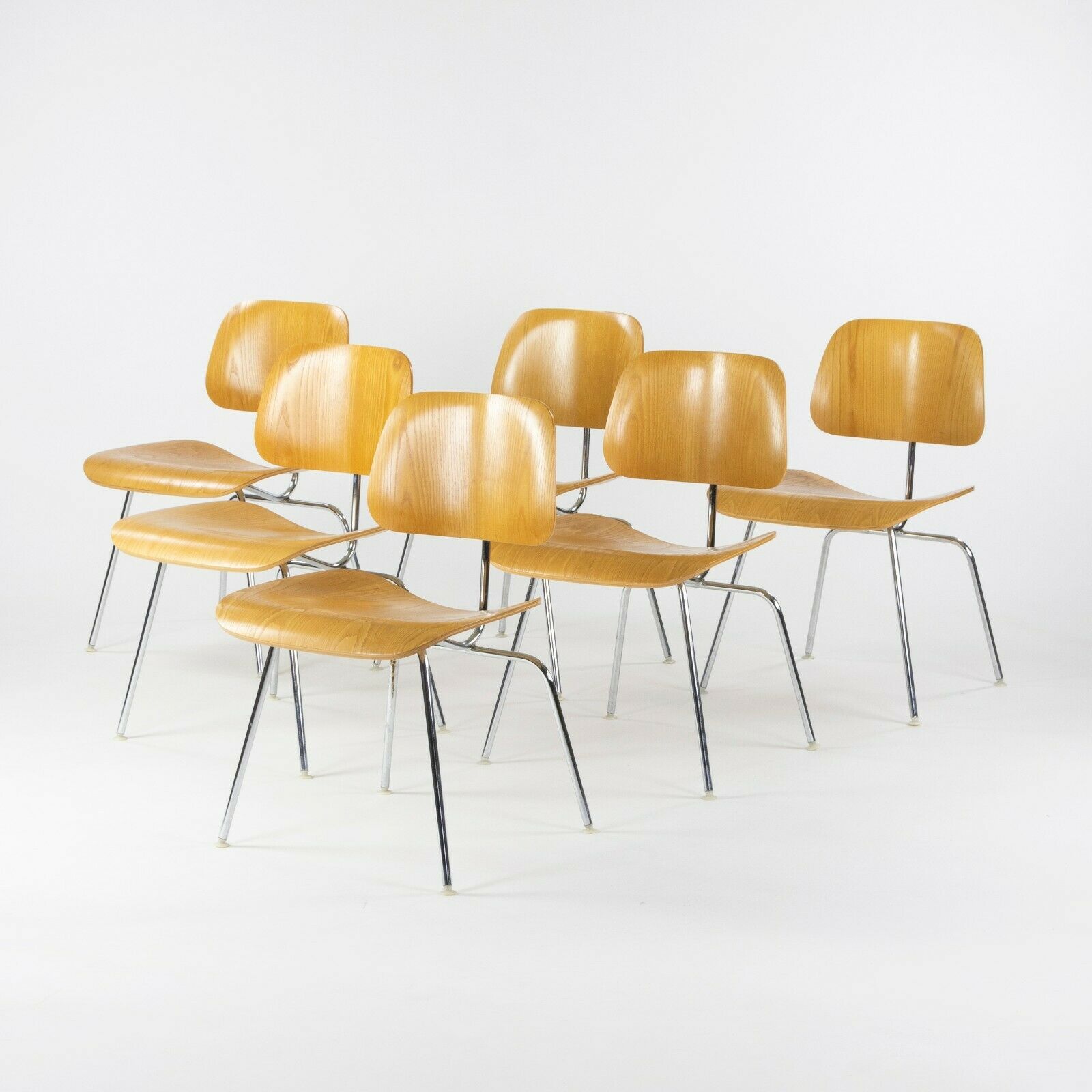 Listed for sale is a set of six Herman Miller Eames DCM dining chairs with white ash plywood and chromed steel frames. These examples were designed by Ray and Charles Eames. They have been produced by Herman Miller since the 1950s. This is a terrific and authentic set, which had its foil labels pulled off at some point, though are guaranteed as authentic. Another possibility is that these may have been Herman Miller contract pieces (produced for a large commercial project), which could mean that they would be produced without labels. The chairs are in excellent condition with some light wear to the plywood from use. Based on the construction and materials, these date to the late 1990s or early 2000s. The price listed is for all six chairs. They measure 29.75 inches tall by 19.75 inches wide and 20.75 inches deep.