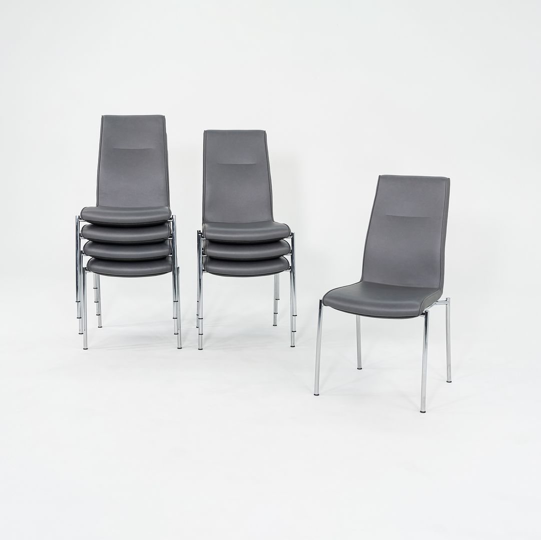 This is an Ona Plaza Stacking Side Dining Chair, initially designed by Jorge Pensi for Kusch & Co. in Germany in 1996. These examples date to 2013. Their minimalist design features a chromed-steel frame having 4 legs, and has an elegant high back. These examples are upholstered in grey leather. The listed price includes one side chair, and we have eight available for purchase.