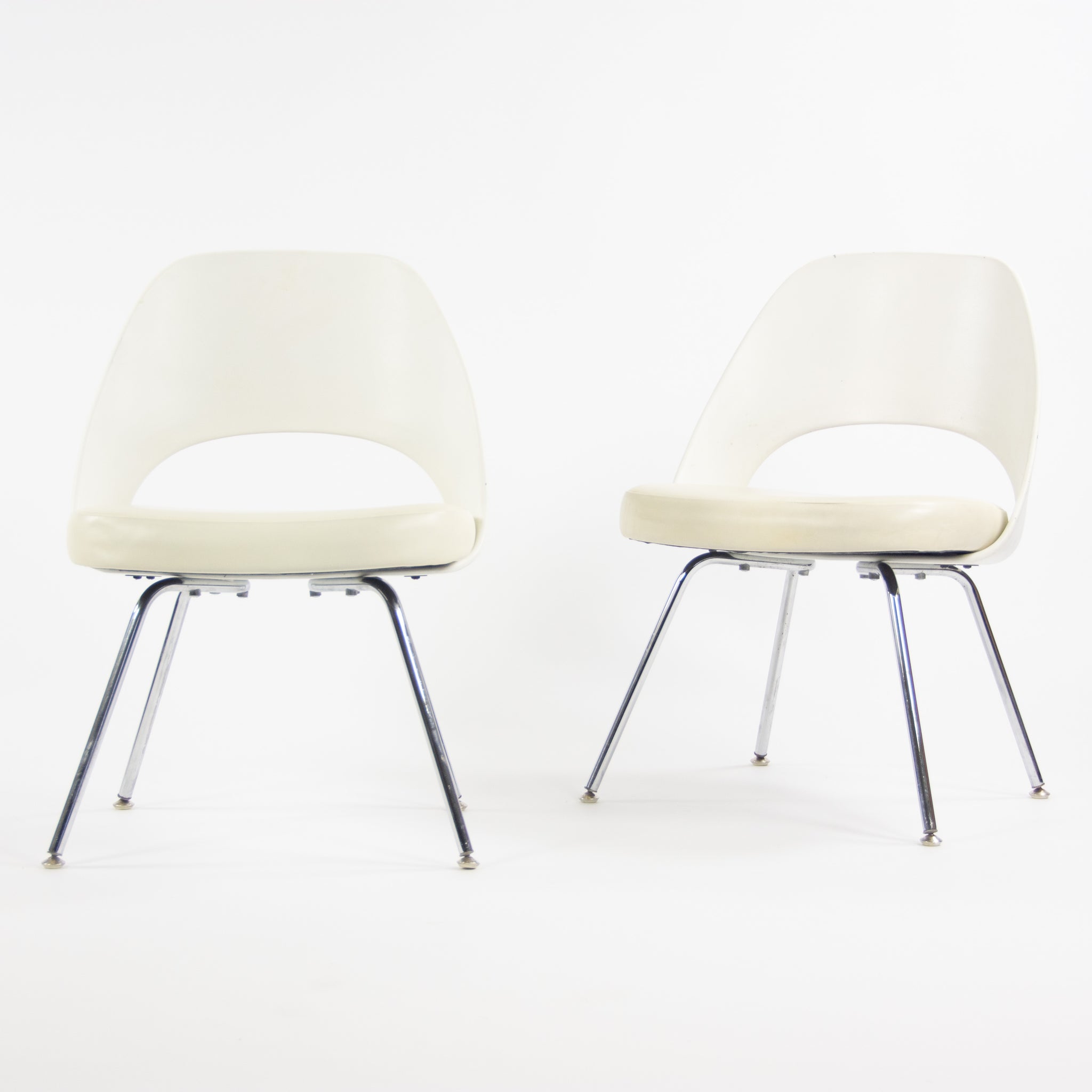 Listed for sale is a fantastic set of (sold separately) Eero Saarinen Executive Armless chairs with white vinyl upholstery and chrome bases, produced by Knoll. These chairs have the white plastic backs, rather than upholstered backs.