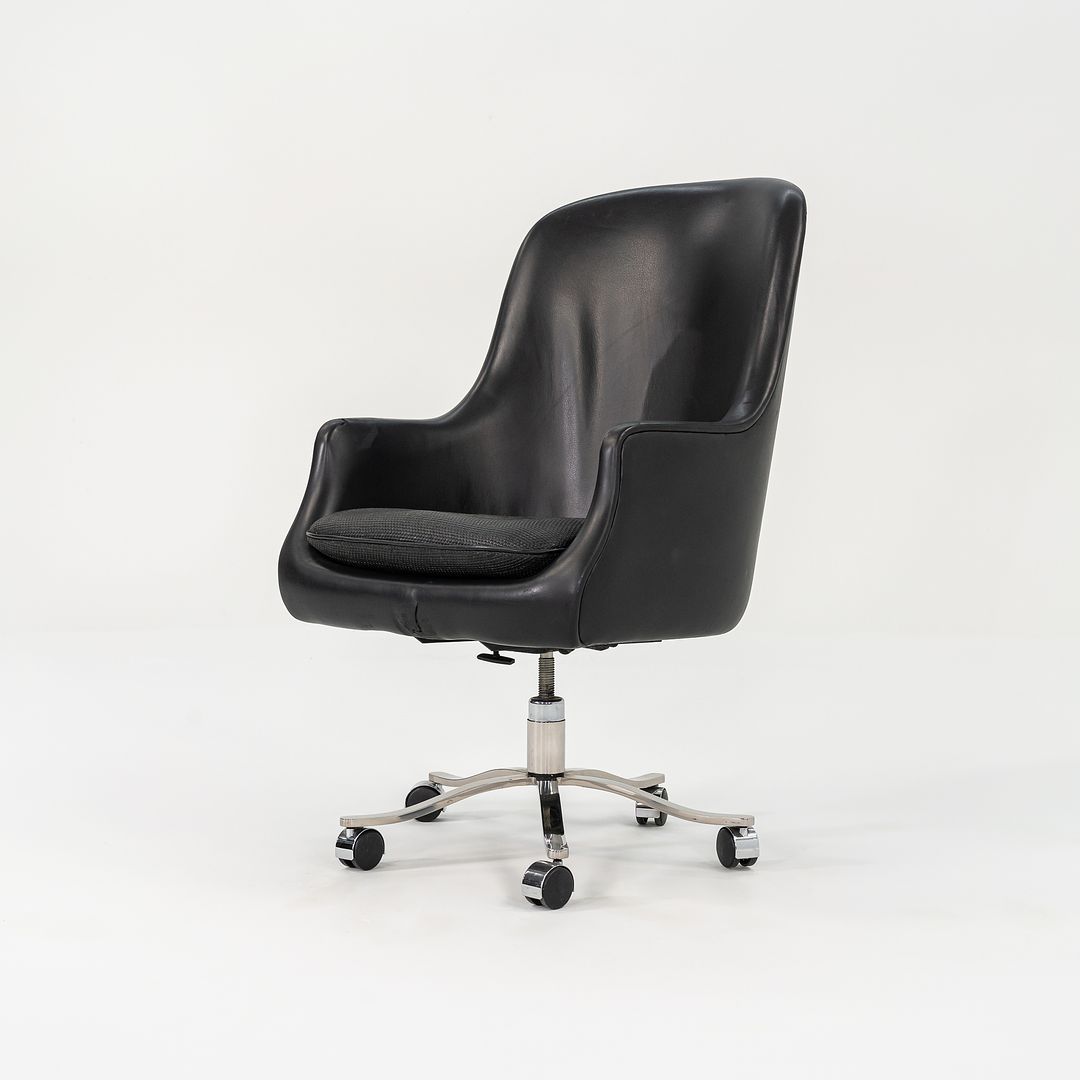 This is a single original Alpha bucket executive desk chair, designed by Nicos Zographos in 1964. The piece was produced by his namesake Zographos Designs Limited. It features a polished stainless steel base and has fine black leather upholstery. The chair is in used condition, with significant signs of wear and use. See photos.