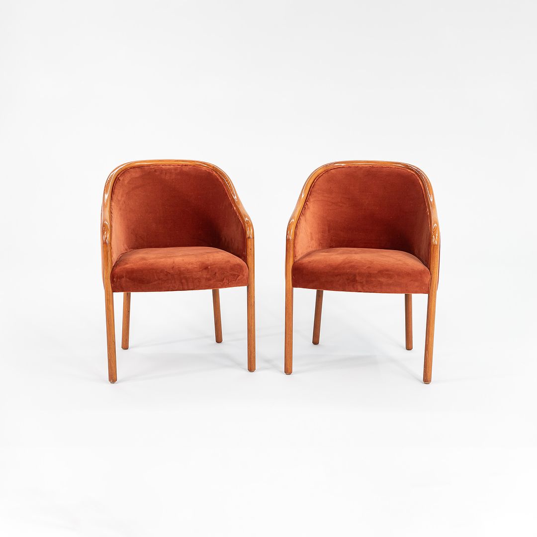 This is a pair of Bankers Armchairs, initially designed by Ward Bennett for Brickel Associates in 1965. The listed price includes the pair as shown. The chairs feature solid oak hardwood frames that have been oiled and lacquered, and retain their original terracotta mohair upholstery. These examples date to 1983 and retain their original tags.