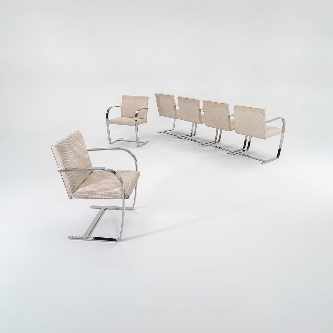 This is a set of 6 Flat Bar Brno Chairs, Model 255, originally designed by Mies van der Rohe in 1930. These particular examples were manufactured by Knoll in 1984, and the listed price includes the set of 6 chairs. They feature a chromed steel cantilever frame, and have an upholstered seat and back.