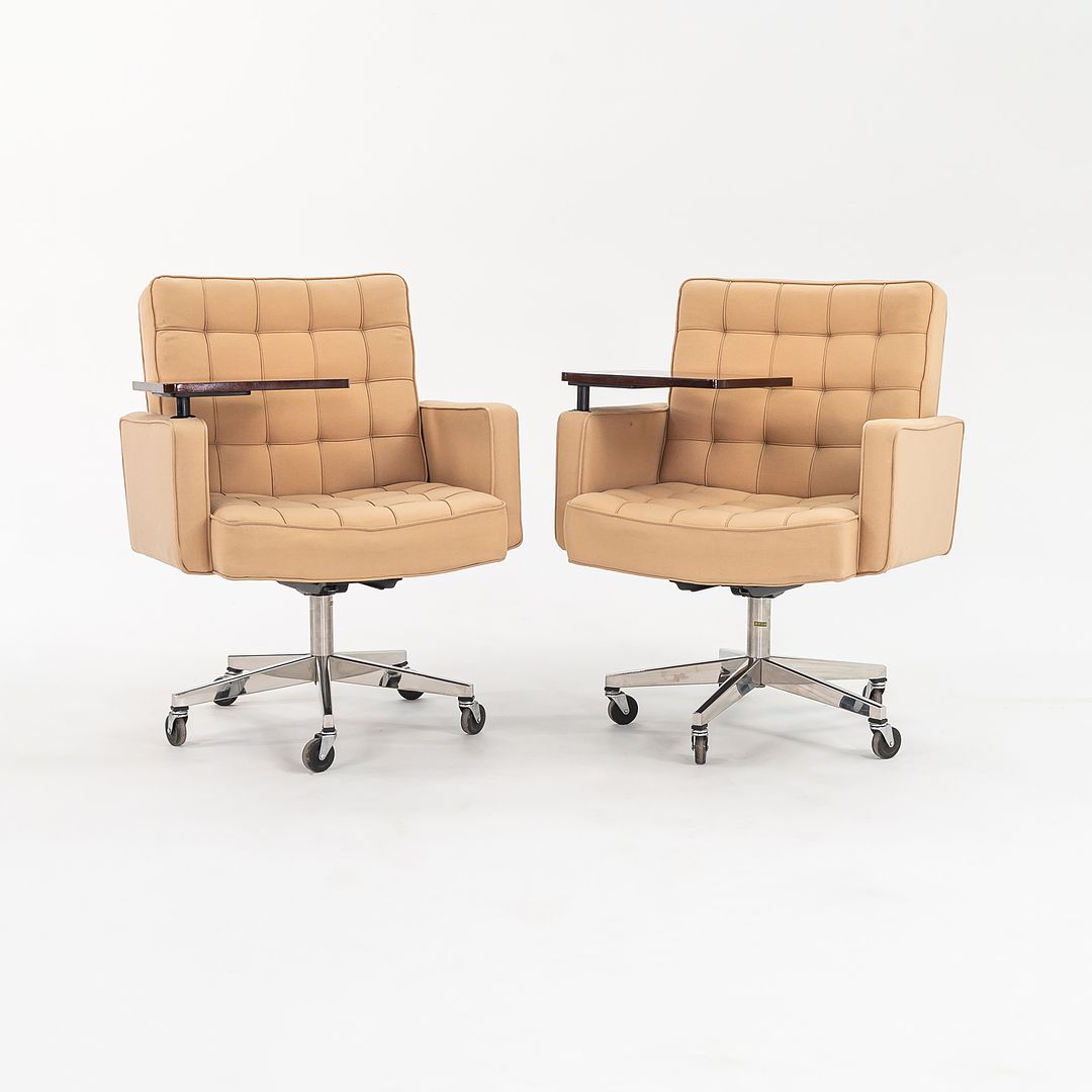 Each chair measures 25.5 inches deep, 25.5 inches wide, and 33.5 inches tall. They have a seat height of 20 inches and an arm height of 27.75 inches. The fabric is in nice original condition. The polished steel bases have some light patina to the finish, and the casters show signs of prior use. Overall, these chairs are in very good condition with some wear apparent. Please see photos.