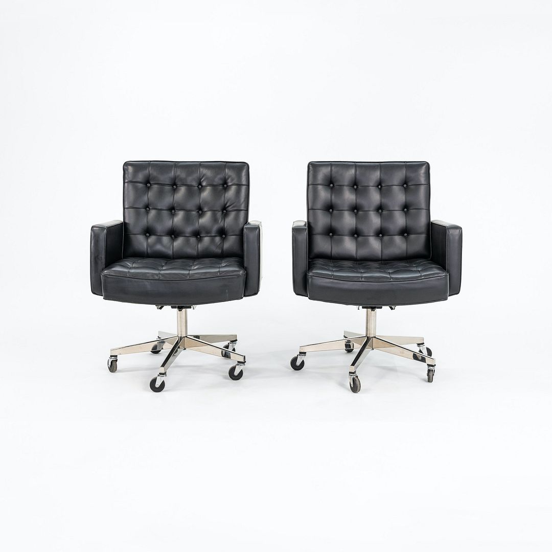 These are Cafiero Executive Desk Chairs, Model 187-DSBS, designed by Vincent Cafiero for Knoll in 1960. These examples date to the 1970s, many of them dated 1979. The listed price includes one Cafiero chair and we have several on hand. Their design features black tufted leather upholstery with piping, and has a swiveling 5-point steel base on casters.