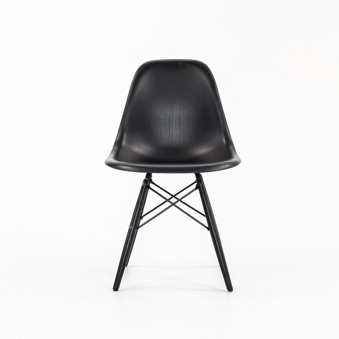 This is an Eames DSW Side Chair, originally designed by Ray and Charles Eames for Herman Miller in 1948. These particular examples were produced by Herman Miller in the USA in 2019. The listed price includes one chair and we have several available for individual sale. These chairs feature molded wood shells that are ebonized, and have black dowel bases. DSW is an acronym for Dining Height Side Chair Wood Base. The wood version was not introduced until quite recently, as these were historically made in fiberglass.