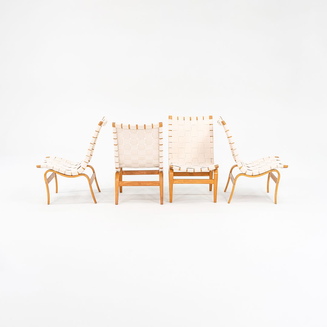 This is an Eva Hog lounge chair, Model 41, initially designed by Bruno Mathsson for Firma Karl Mathsson in 1941. These particular examples were produced in Sweden in the 1960s. The listed price includes one lounge chair, and we have four available for purchase. These all came from the same estate, which was an extraordinarily well cared for time capsule full of Scandinavian greats in the Rockefeller apartments in Manhattan. Their design features a frame constructed from steam-bent laminated beech, and they have large-scale webbed canvas seats in an off-white.