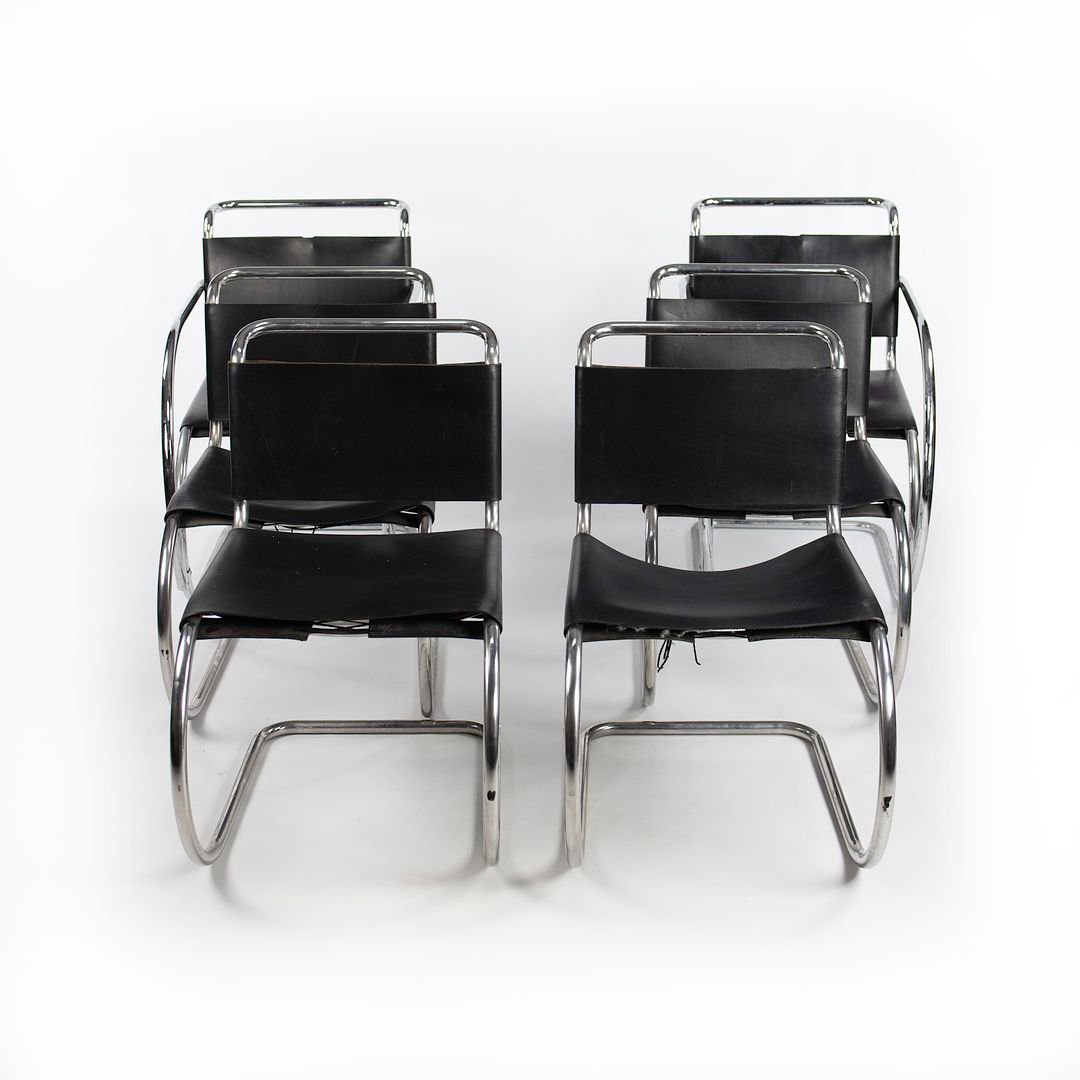 Each of the four MR10 chairs measure 27.25 inches deep, 27.25 inches wide, and 31 inches tall. Each of the two MR20 chairs measure 30 inches deep, 27 inches wide, and 31 inches tall. Their seat height is 17.25 inches. This set retains its original leather that is in great shape and has only some small scuffs and scratches to the surface. Some of the lacing on the underside of the chairs is loose in the photos, but this will be remedied before shipment. The chromed steel frames look great and are not cloudy or pitted. There is a light patina under the bottoms of some, only to be seen when the chairs are turned over. Overall, this set of chairs is in very good vintage condition with light wear. Please see photos.