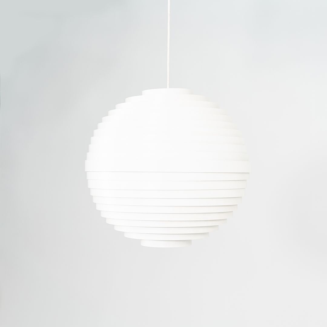 This is a Large ‘Dynamic’ Ball Pendant Suspension Lamp, initially designed by Wilhelm Vest for Vest Leutchen in 1967. This pendant dates to the late 1960s. The lampshades are made of solid metal, consisting of 21 white lacquered metal rings that are connected with ropes. The shade is marked with the original Vest, Austria label. In 1969, the Dynamic suspension lamp received an iF Design Award.