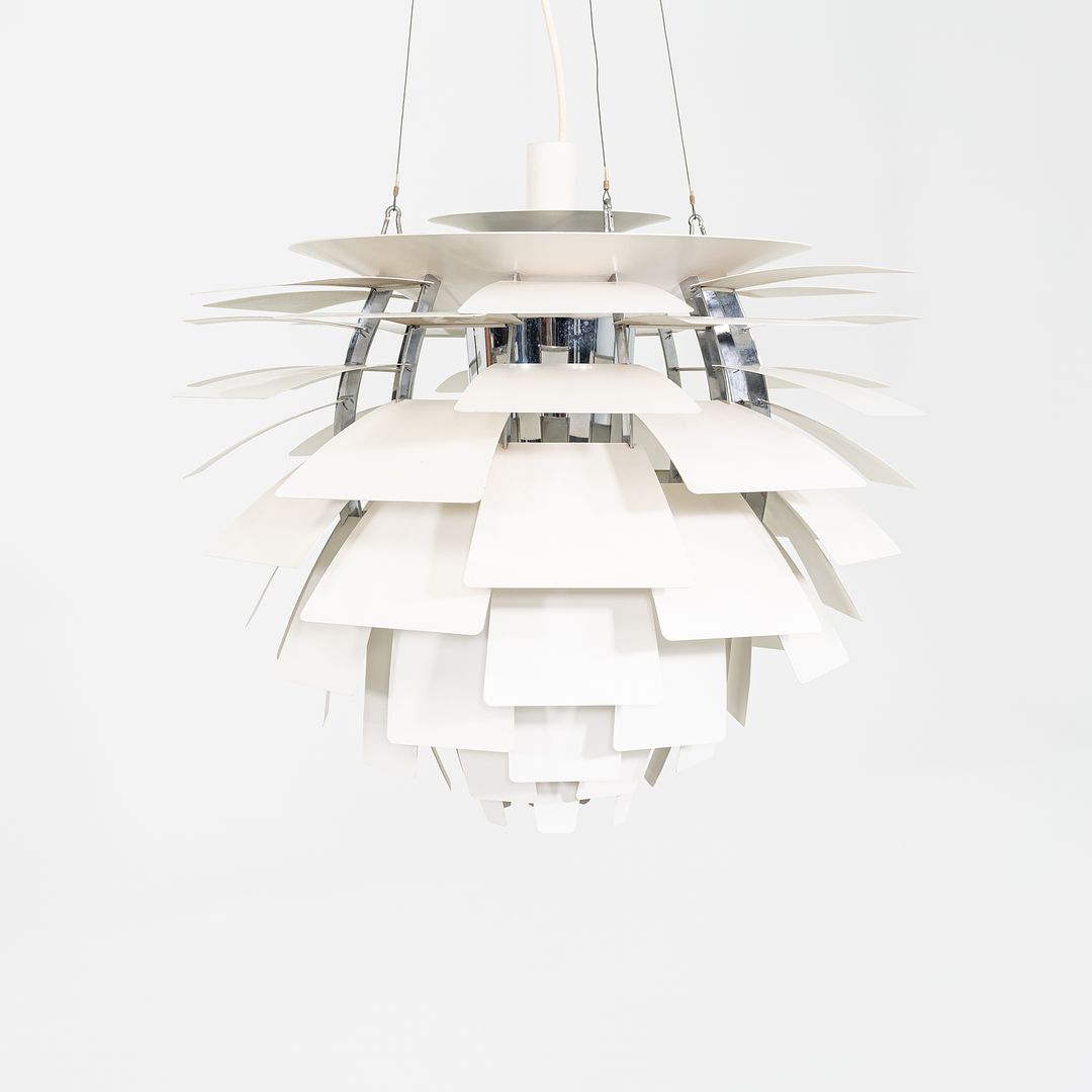 This is a PH-Artichoke pendant, initially designed by Danish architect and designer Poul Henningsen in 1957. This example dates to the 1970s and was produced by Louis Poulsen in Denmark. This large iteration has 72 leaves with a white finish.