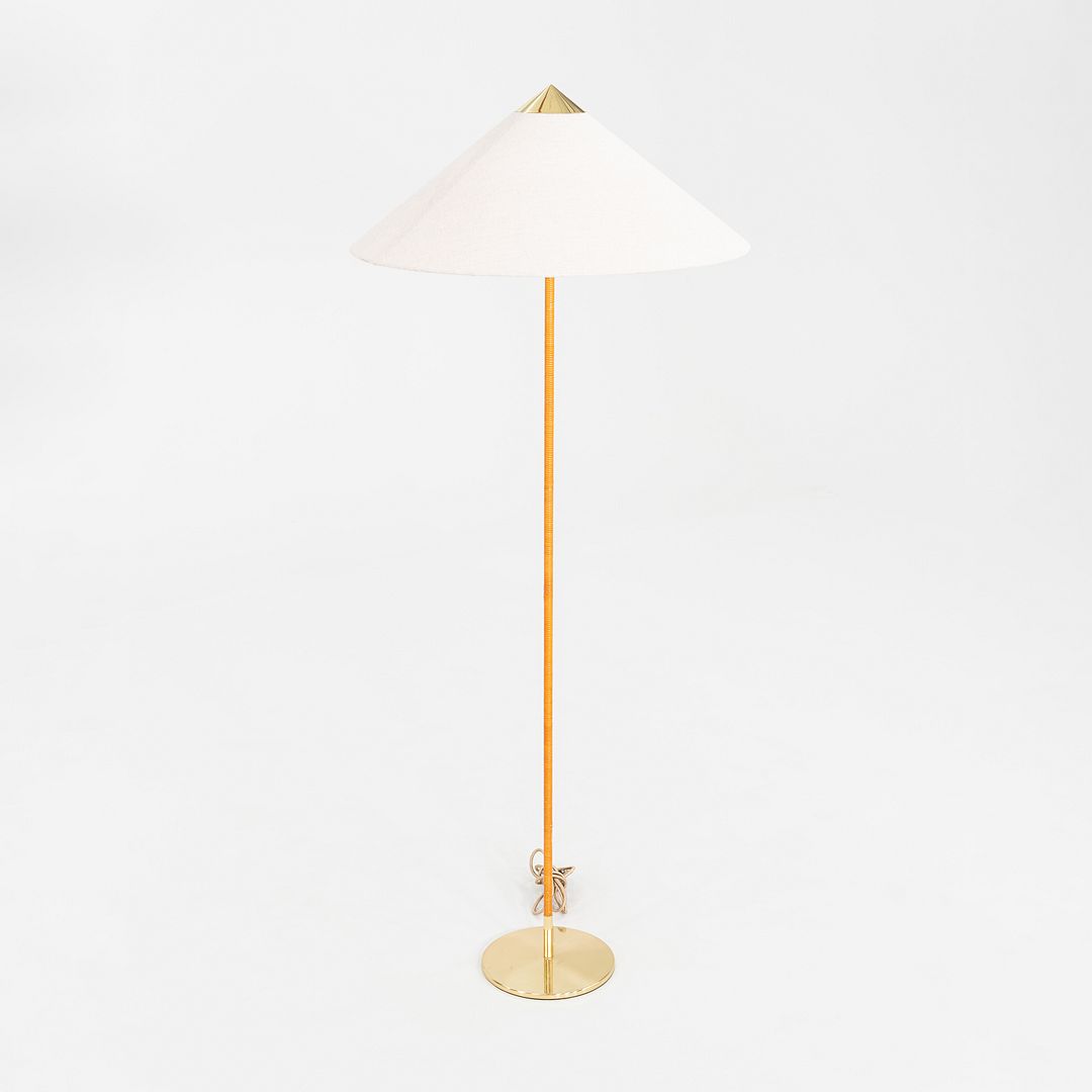 This is a 9602 Floor Lamp, originally designed by Paavo Tynell in 1938 the hotel Aulanko. This particular example was produced by GUBI in Denmark in 2024. Commonly referred to as the “Chinese Hat” lamp, this piece features a wide, gently flared canvas shade paired with a rattan-wrapped stem and a brass base.