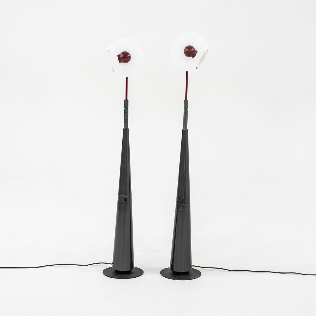 This is a pair of Post-Modern Floor Lamps, Model 1195, designed by Pier Giuseppe Ramella for Arteluce in 1985. The listed price includes one lamp, and we have two available for purchase. Their design features an enameled grey metal base with burgundy resin accents, and they have frosted and clear glass refractory shades. The heads of the lamps have a diffuser that can rotate 360 degrees. Their on/off button is located on their base, they use a 20W 12V halogen bulb.
