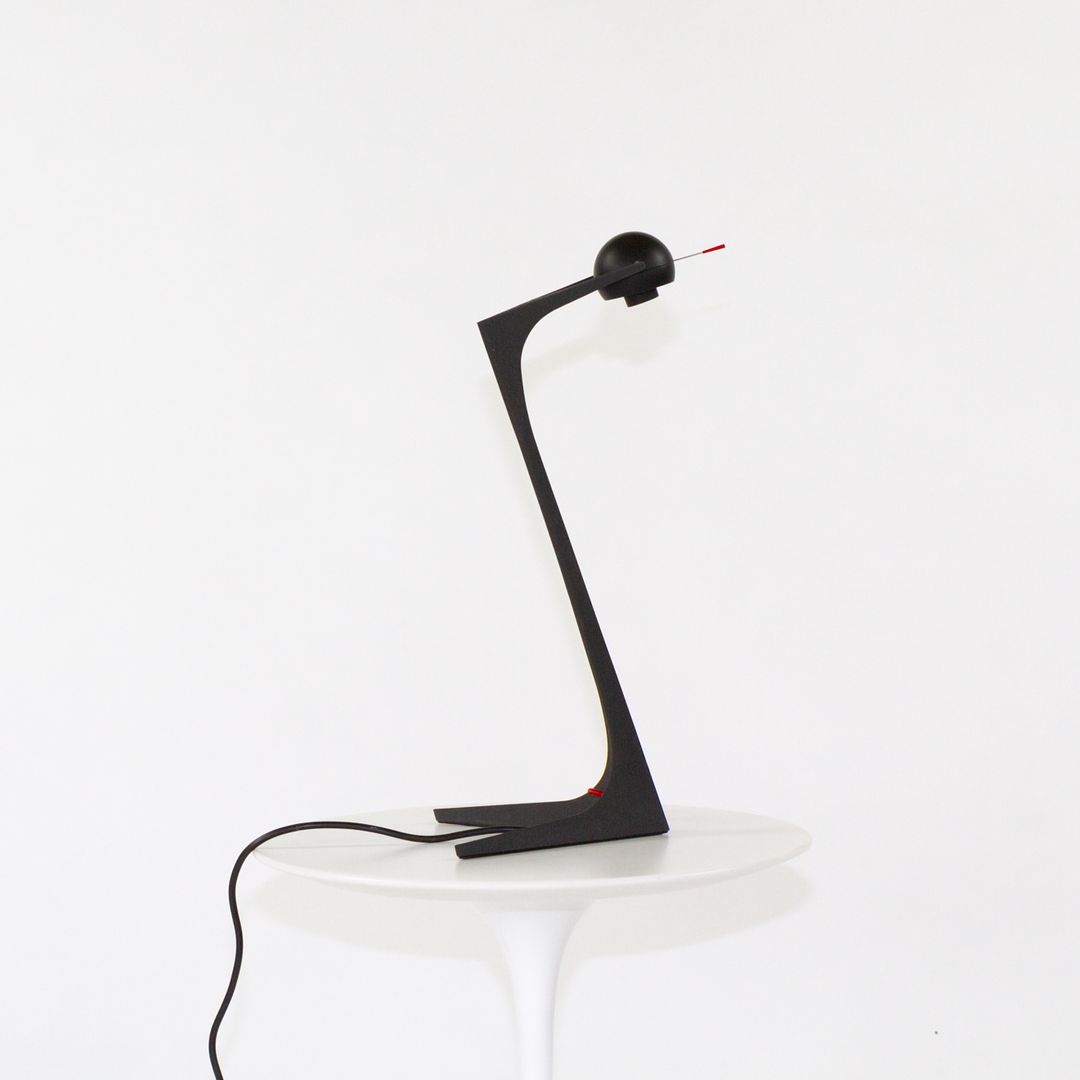 This is an ‘Onidia’ table lamp, designed by Santiago Calatrava for Artemide in 1990. The piece was produced in Italy. The lamp is made of cast black polyurethane foam, and it has a white opal methacrylate diffuser. It has pops of bright red on the instruments, indicative of the Postmodern “High Tech” subgenre.
