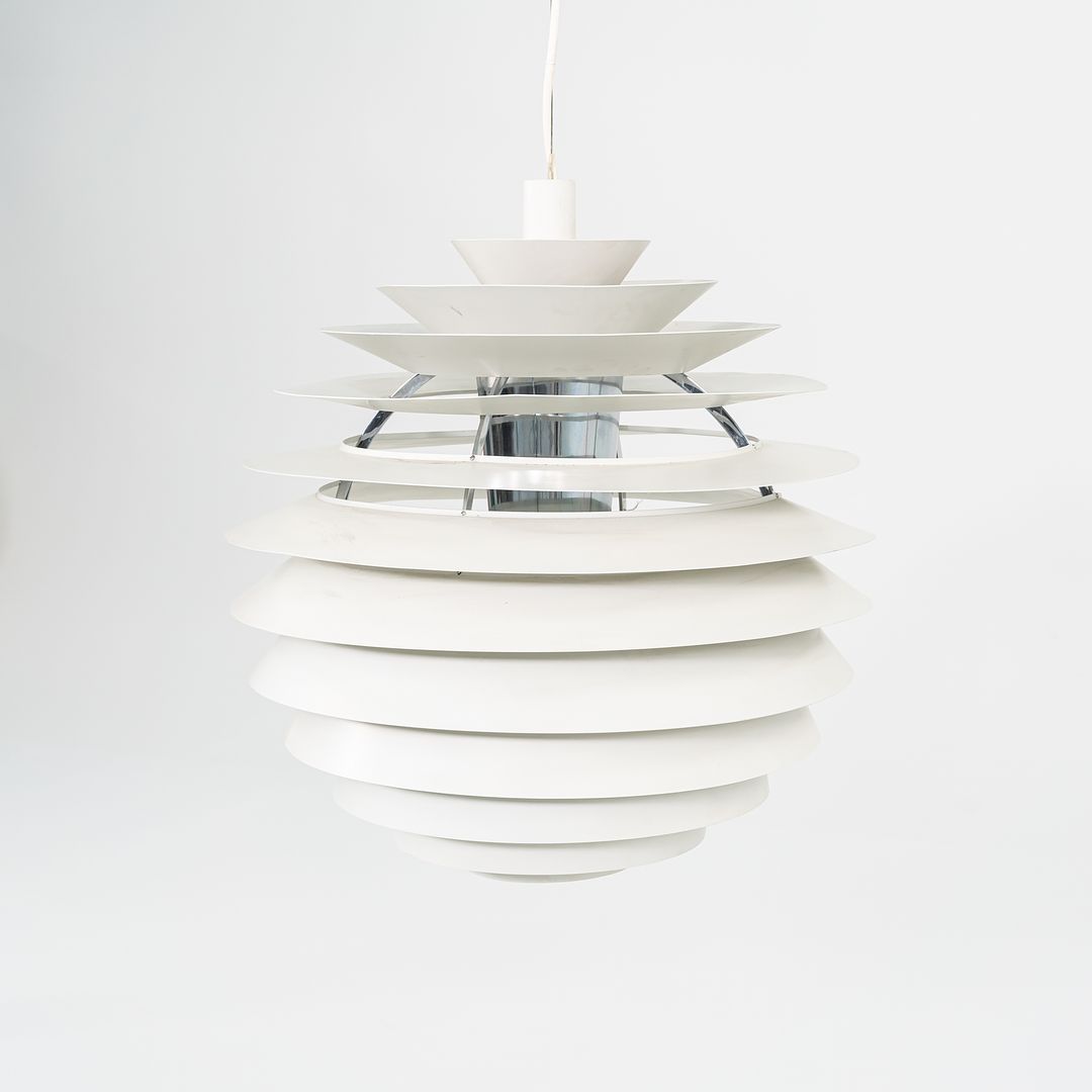 This is a PH ‘Louvre' Ceiling Pendant, initially designed by Poul Henningsen for Louis Poulsen in 1957. These examples date to the 1980s. The listed price includes one pendant, and we have three pendants available for purchase. The design originated in Denmark, incorporating thirteen aluminum shades that are lacquered in white. The undersides of the shades are matte, and the tops are glossy, intended to prevent glare and to diffuse light evenly. The spherical nature of the piece ensures uniform light around the fixture, illuminating both walls and ceiling without an exposed bulb. Even when turned off, the pendant pleases the eye with its sculptural form.