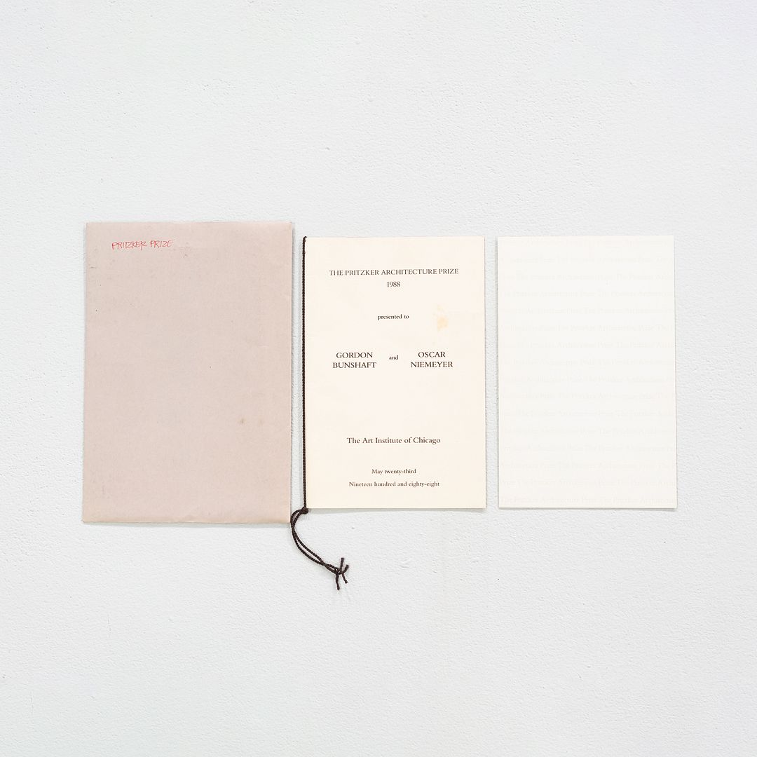 This is the official program from the 1988 Pritzker Architecture Prize ceremony honoring Gordon Bunshaft and Oscar Niemeyer, accompanied by Bunshaft’s personal invitation to the event. These are original artifacts from Bunshaft’s Travertine House in East Hampton and came directly from the estate of Gordon and Nina Bunshaft. A letter of provenance from the heirs will be included with the materials.