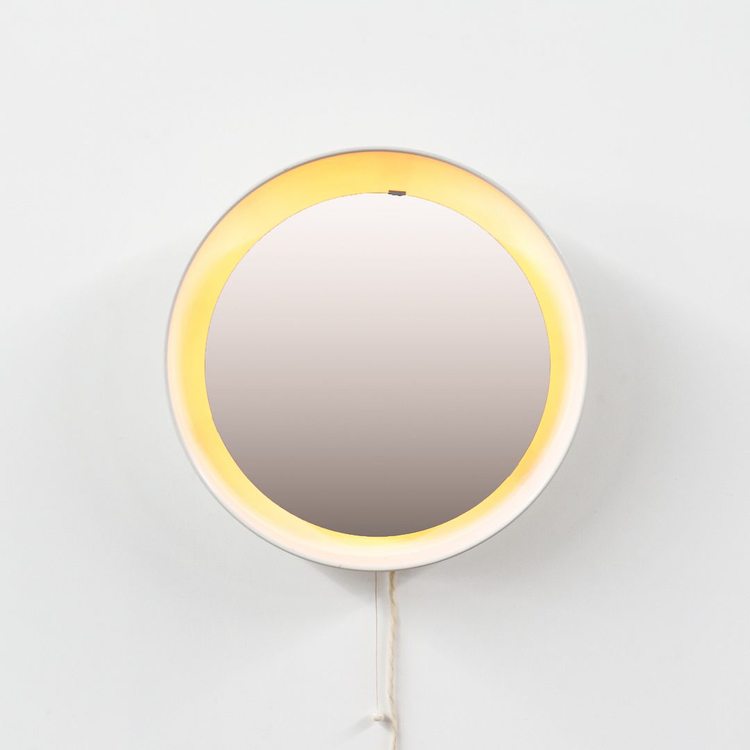 This is a PH Boudoir Mirror, initially designed by Poul Henningsen for Louis Poulsen in ca. 1939. This piece dates to around 1965. The rim of the piece is made of matte white aluminum, and it has a metal structure that secures the mirror in the center. Poulson wanted to design a mirror that would provide a reflection of superior clarity; The idea of a backlit mirror was a novel idea in 1939.