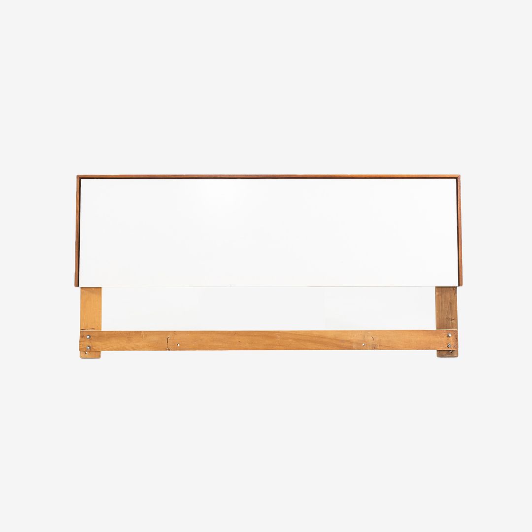 This is a model 740 WP headboard, designed by Florence Knoll for Knoll International in 1956. This particular example dates to the 1960s. The piece is constructed of walnut with a plastic laminate insert in white.