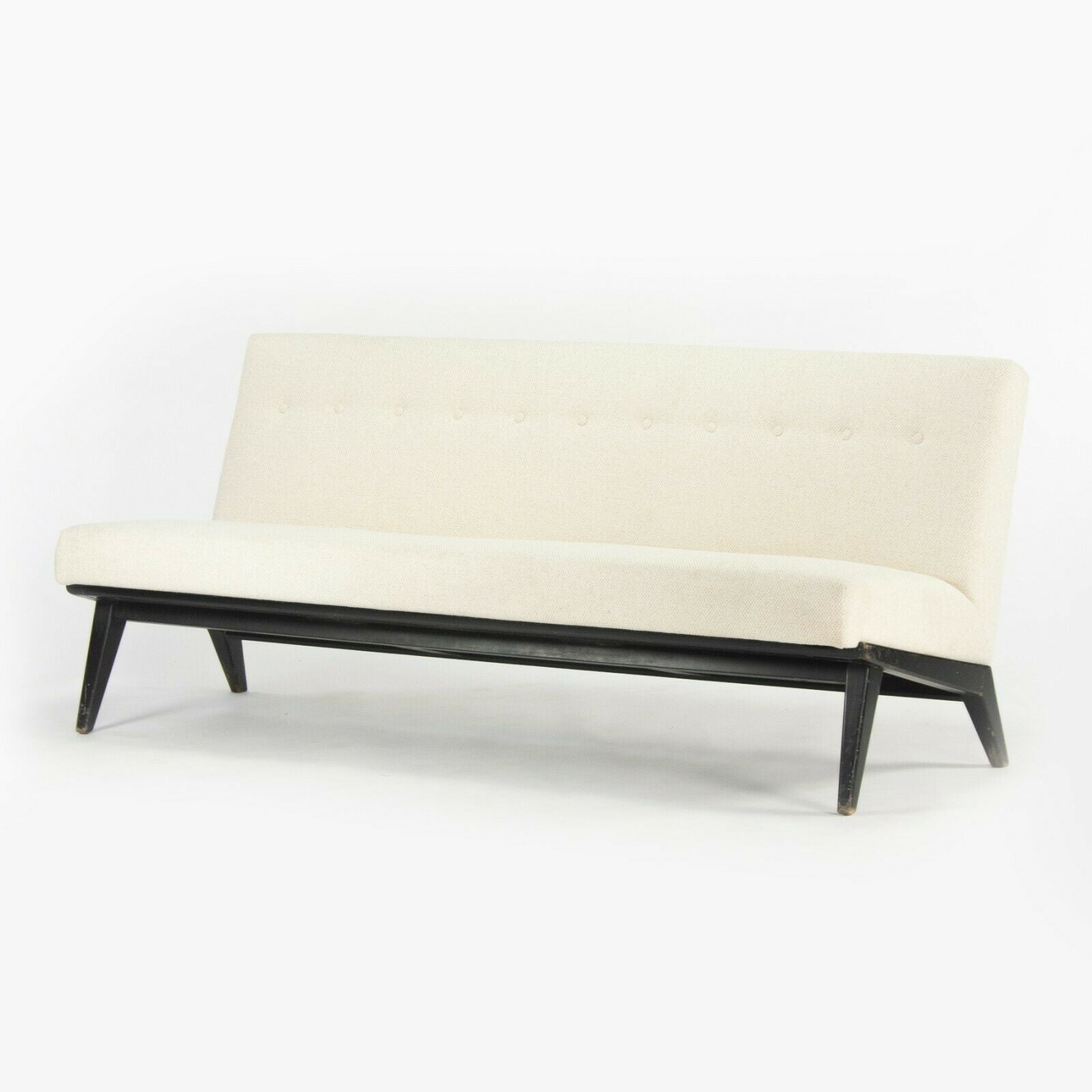 Listed for sale is an exceptionally rare and early Jens Risom Sofa, model number 23, produced by Knoll and labelled H.G. Knoll Products. This particular examples dates to circa 1949. The model itself was designed in 1946 and made during the earliest production period, as the labels transitioned to Knoll Associates labels during the beginning of the 1950s. This sofa came from a Pittsburgh, Pennsylvania estate and was just freshly reupholstered in a Knoll Textiles off-white boucle fabric (slightly different in pattern than their classic boucle). The sofa has an ebonized finish, which can be touched up and/or restored if desired. The sofa is in terrific condition. As noted in the photos, there are a couple of light soiling marks on the back of the piece from moving it to our warehouse from the upholstery shop. We can have an upholstery cleaner come in to clean that area prior to shipping at the new buyer's request as well.