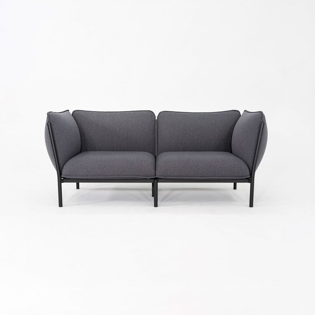 This is a Kumo Two Seater Sofa, originally designed by Norwegian design duo Anderssen & Voll for HEM. This particular example was produced in the 2020s. Kumo—meaning “cloud” in Japanese—embodies a soft, sculptural form with inviting curves and a compact footprint. This example is upholstered in a grey fabric with plush seat and back cushions, and the sofa rests on discreet black steel legs.