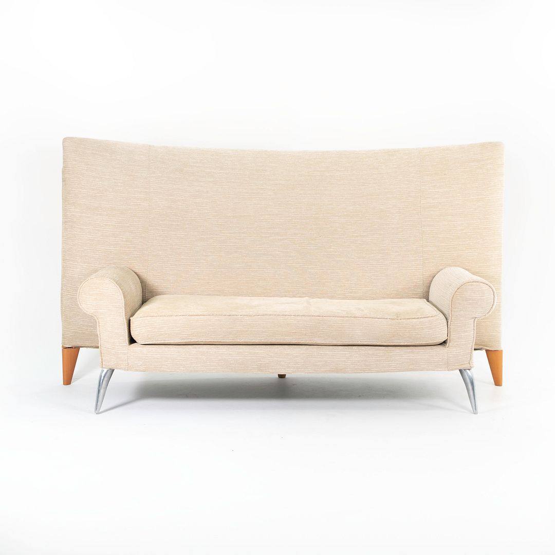This is a “Royalton” Sofa, designed by Philippe Starck and produced by Driade shortly after the design's introduction in 1988. In the late 1980s, Starck was approached by hotelier Ian Schraeger to design a line of furniture for a new project he was working on, the Royalton Hotel in New York City. This large-scale sofa was designed for the lobby. The sofa features curved front legs in polished cast aluminum, and legs of solid beech in reverse. The sofa has a solid steel frame with a thick foam pad. It is currently upholstered in a nubby light tan fabric.