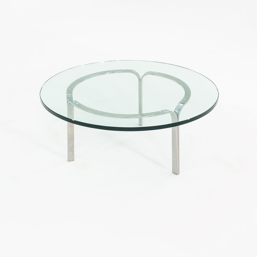 This is a Round TA.42G.36 Ribbon Coffee Table, initially designed by Nicos Zographos in 1960. This particular piece was produced by Zographos Designs Limited in the USA in the 1960s. The sophisticated design features a highly polished stainless-steel base, and has a 3/4 inch thick glass top. Zographos was known for utilizing materials of only the highest quality, and the caliber of the workmanship in his pieces is outstanding.