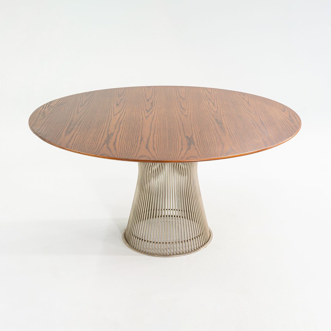 This is a Platner dining table, model 3716T, initially designed by Warren Platner for Knoll in 1966. This example dates to the late 1960s. Its design features a base constructed with vertical steel rods that are welded to circular horizontal and edge-framing rods. The base is truly a work of art in itself. The original stained oak top has been newly refinished.
