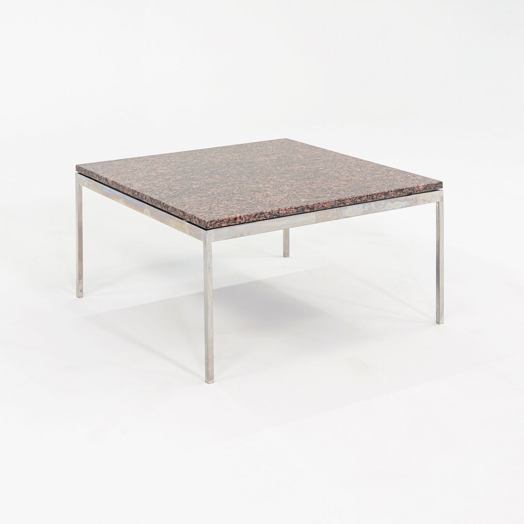 This is a Square Coffee Table, Model TA-2, designed by Davis Allen under the leadership of Gordon Bunshaft within SOM. It’s possible that Nicos Zographos played a role in the execution of this, though the detailing is more typical of Davis Allen's work due to the perfectly sharp corners. This sophisticated table has a highly polished stainless-steel base, and has a high-quality granite table top. SOM produced hundreds of their own furniture designs during the 1950s to 1980s. This was a classic example.