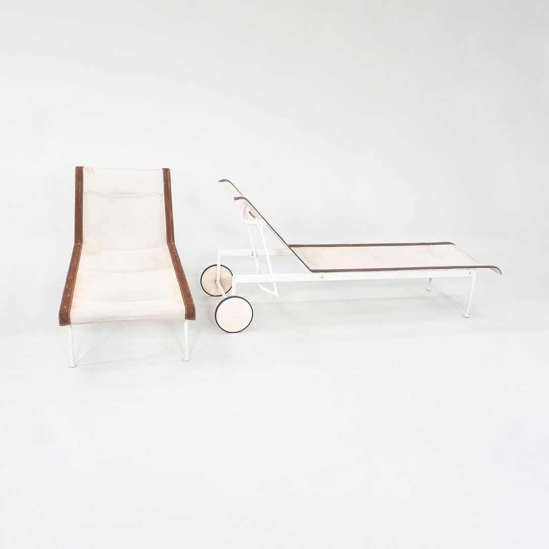 This is a 1966 Adjustable Chaise Lounge, originally designed by Richard Schultz for Knoll and introduced in 1966 as part of his iconic Leisure Collection. This example was produced in the 1970s. The chaise features a cast and extruded aluminum frame with a weather-resistant white powder coat finish, complemented by a mesh sling seat and backrest. The adjustable back offers multiple reclining positions for customizable comfort.