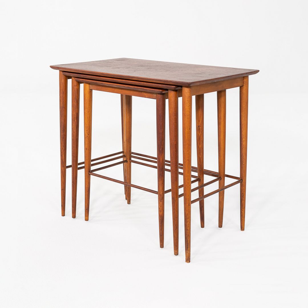 This is a Set of Three Nesting Tables in Teak, produced in Denmark in the 1970s. The legs on these tables are tapered, adding lightness to the design. Their tops are rectangular in form.