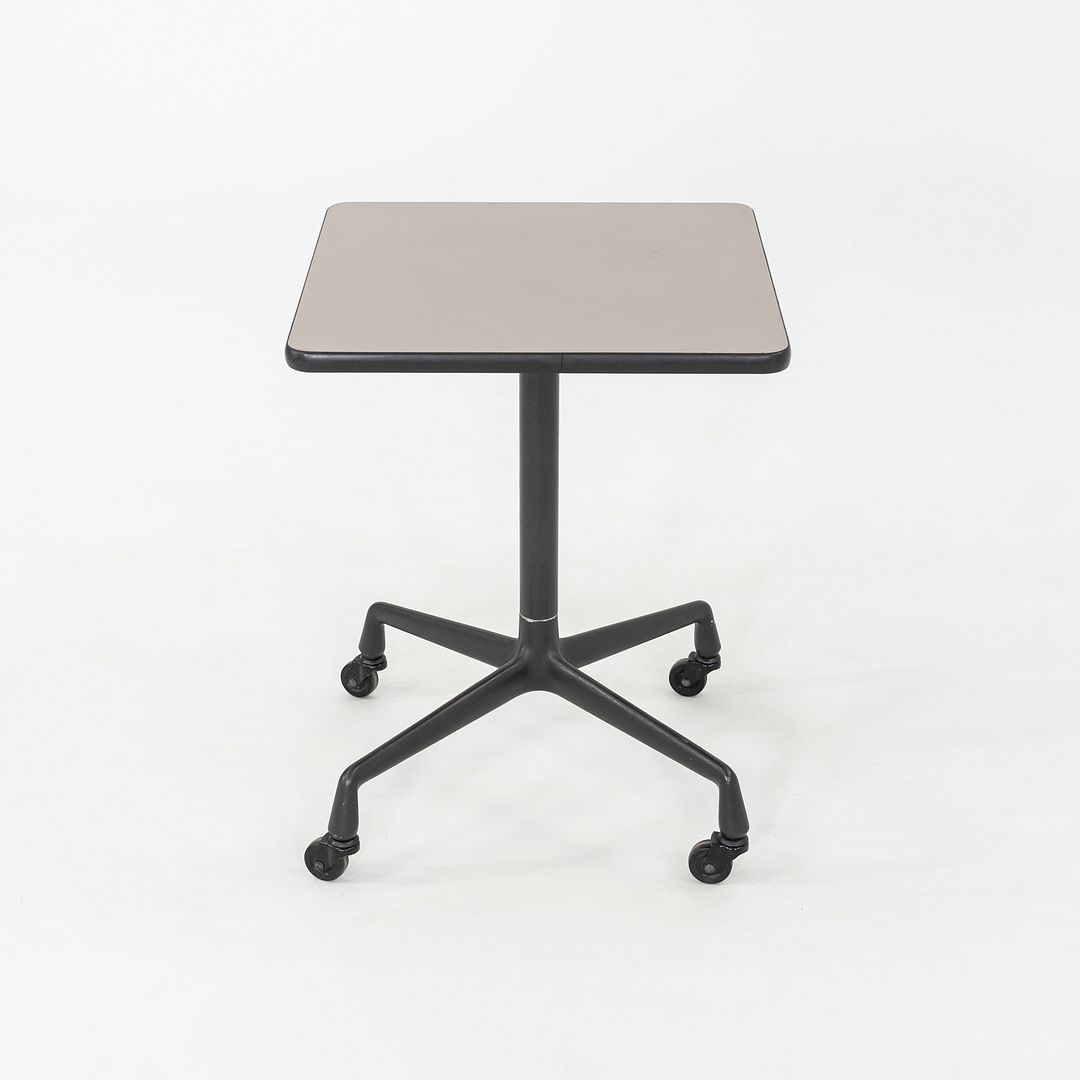 This is an Eames Rolling Side Table on a Universal Base, originally designed by Ray and Charles Eames in 1968. This particular example was produced by Herman Miller in the 1980s. The table's design is comprised of a sand casted aluminum base on castors, a black steel tubed pedestal, and a laminate top.