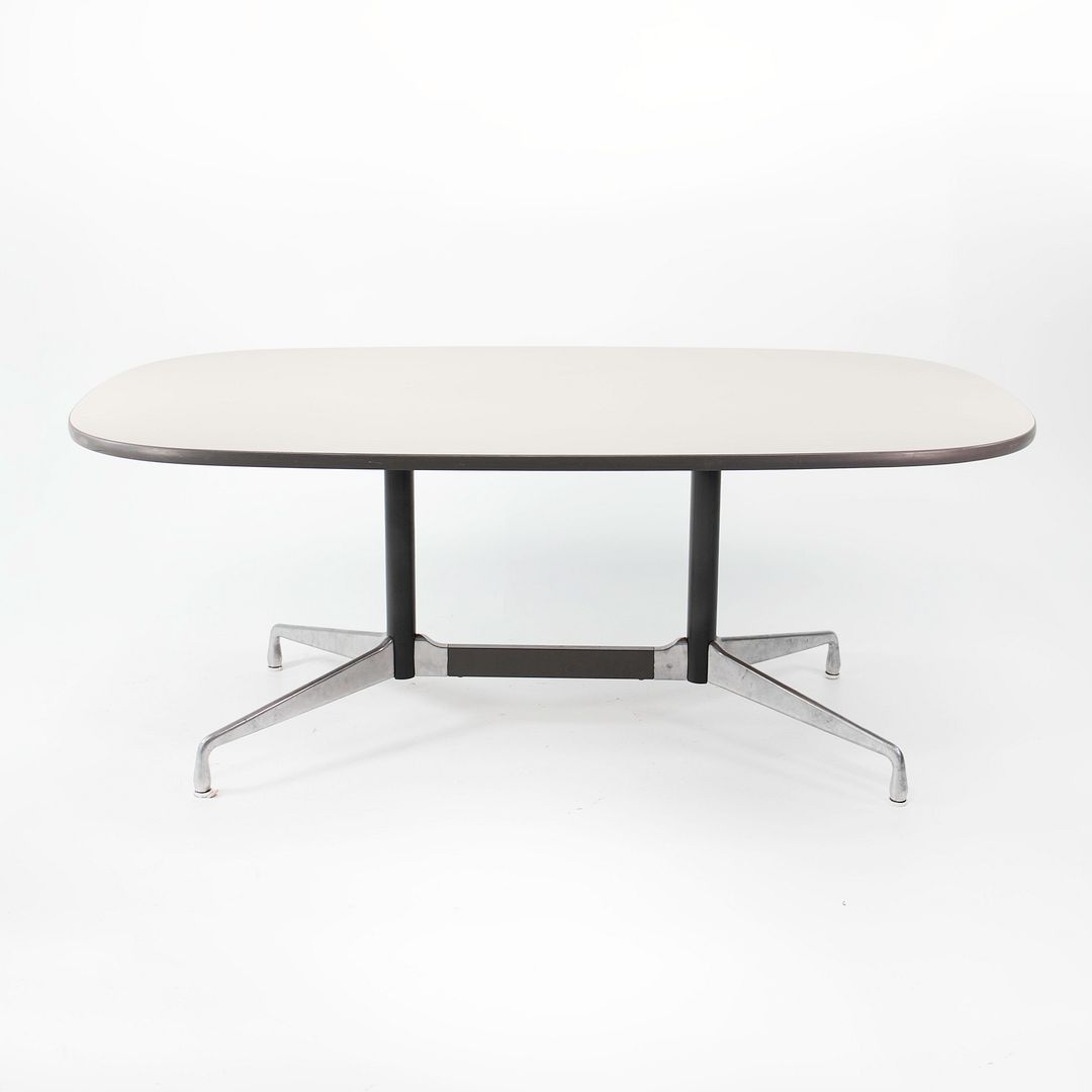 This is a Segmented Conference Dining Table, Model ET151, initially designed by Ray and Charles Eames for Herman Miller in 1964. This piece dates to the 1980s. The table's design is comprised of an aluminum base with a white laminate tabletop.