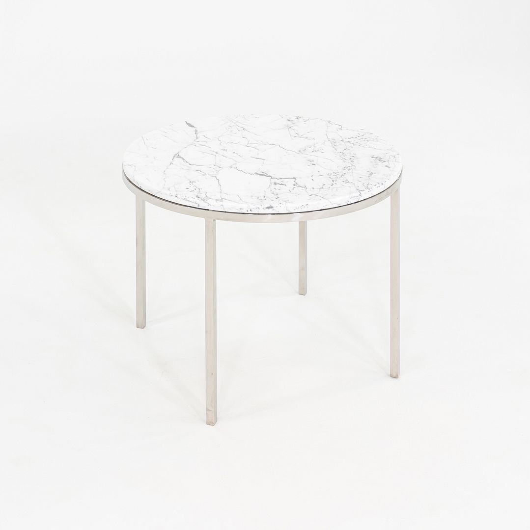 This is a round side table, designed by Davis Allen under the leadership of Gordon Bunshaft within SOM for Treitel Gratz. This particular example dates back to circa 1985. This sophisticated table has a highly polished stainless-steel base, and has a high quality marble table top. SOM produced hundreds of their own furniture designs during the 1950s to 1980s. This was a classic example.