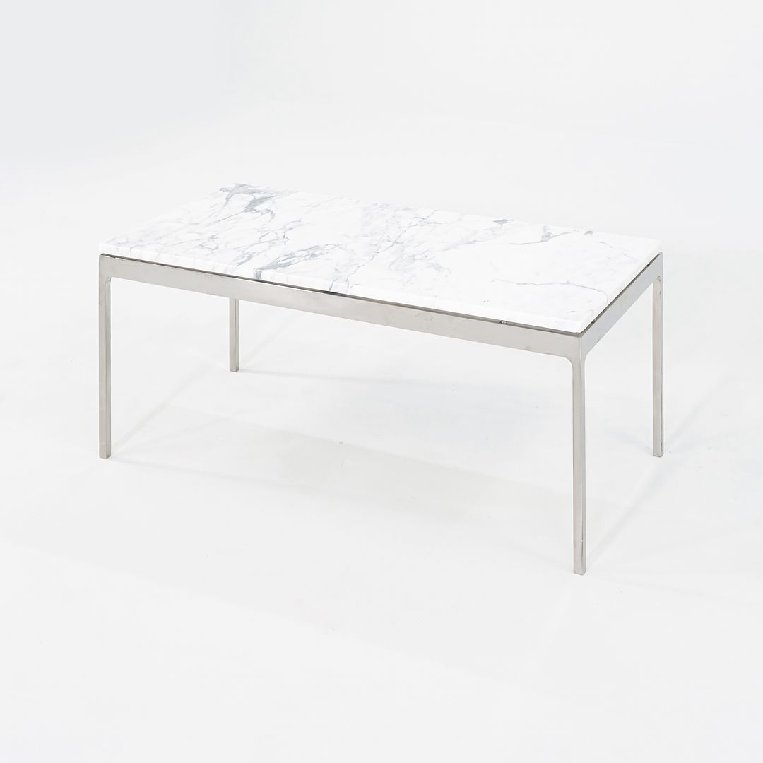 This is a rectangular Coffee Table, Model TA.35.36.72, initially designed by Nicos Zographos in 1960. This particular piece was produced in the 1980s by Zographos Designs Limited in the USA. It has a solid polished stainless steel base, and has a white and grey marble top. The thick white marble slab has grey veins that move throughout the piece, and measures 2cm thick.