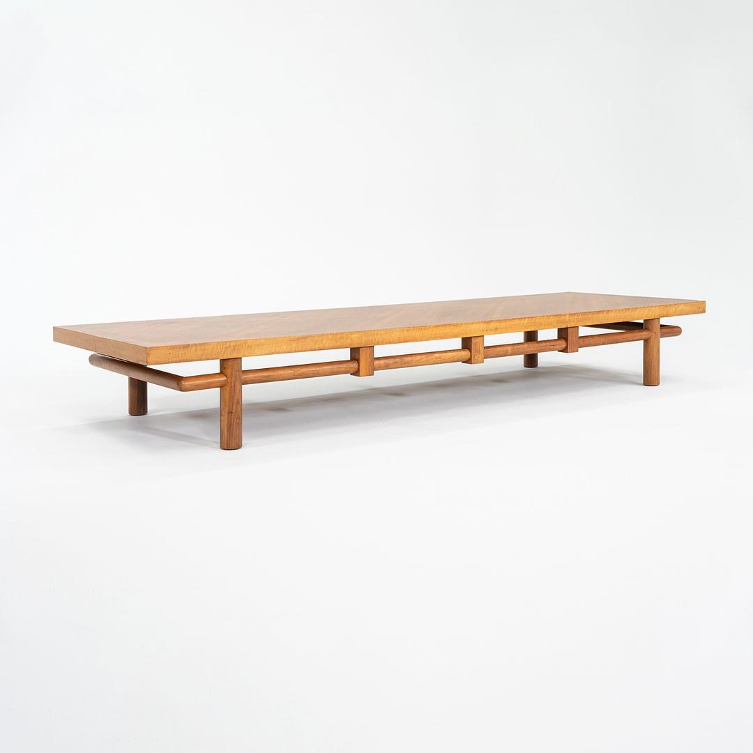 This is a large (oversized) walnut coffee table, designed by T.H. Robsjohn-Gibbings for John Widdicomb in 1953. It is composed of bleached-walnut and has a walnut veneer. The top is unusual in that the walnut was cut on the bias.