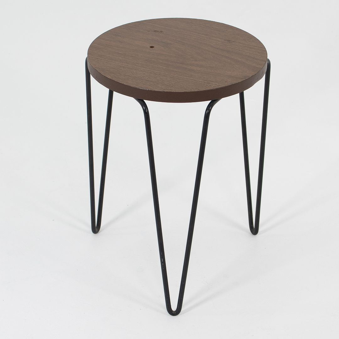 This is a Florence Knoll Stacking Stool Side Table, Model 75, designed by Florence Knoll for Knoll in 1950. This particular example dates to the 1960s. It features a wrought-iron hairpin-leg base, and has a brown faux-wood laminate top. It can be utilized as a stool or as a small side table.