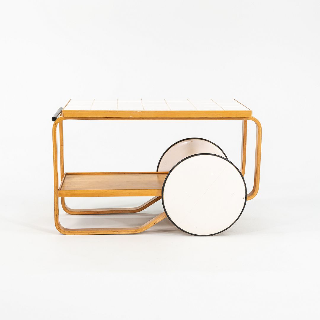 This is an original ‘Tea Trolley 901’ Serving Cart, designed in 1936 by Aino and Alvar Aalto for Artek. The piece was manufactured in Finland circa 1950s. The strong frame is made from birch which has been bent. The top and bottom trays are of form-pressed birch plywood, and the top has a white ceramic tile surface. The wheels are lined with rubber to give it a smooth ride.